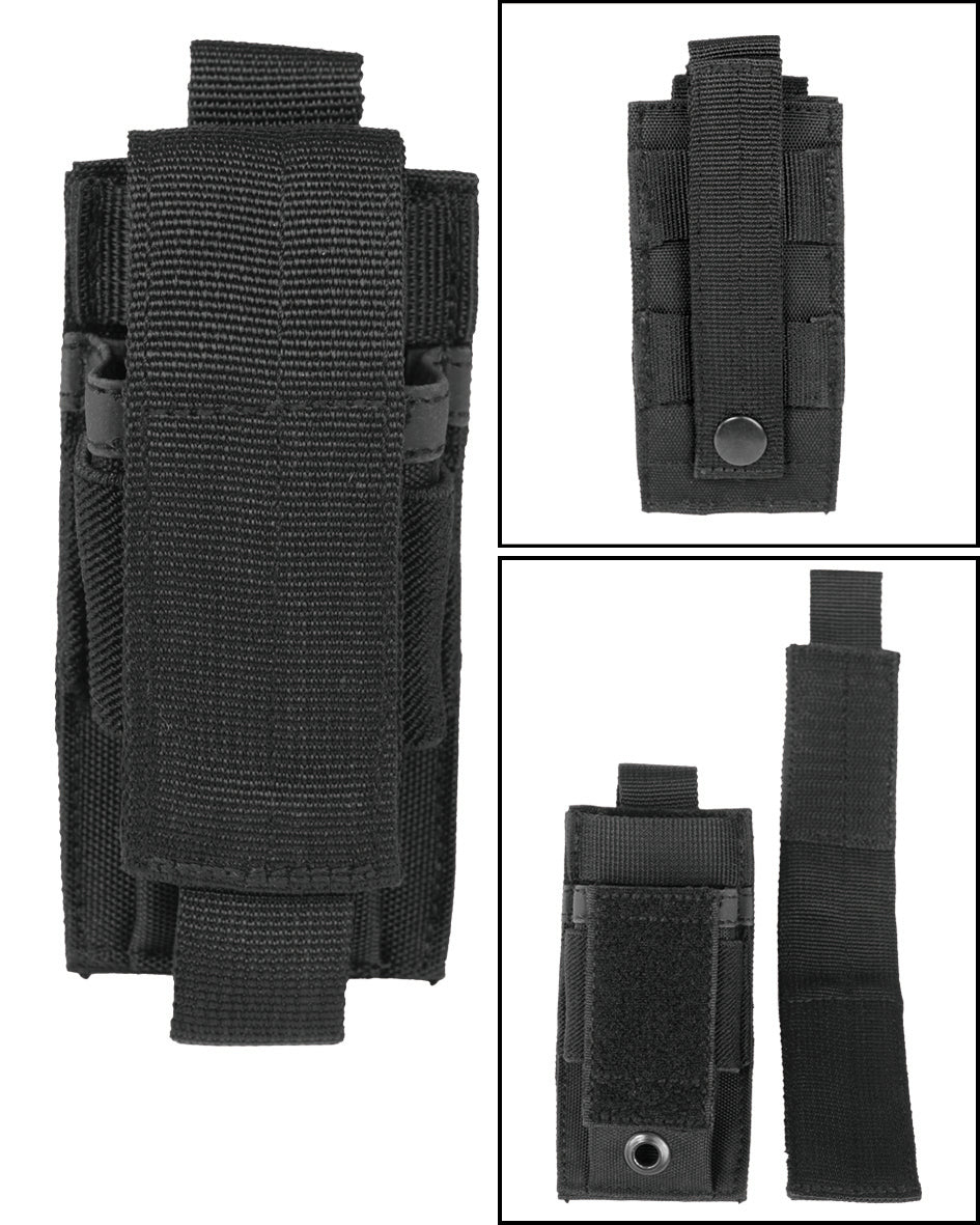 Compatible con sistemas MOLLE y cinturones tácticos, esta funda se integra perfectamente en cualquier configuración de equipo militar o policial. El acabado en negro mate reduce los reflejos y mantiene un perfil discreto en operaciones nocturnas o de baja visibilidad.