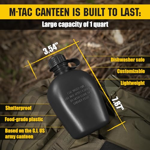 La M-Tac Cantina de Agua Militar es una botella táctica de 34 onzas (1 L) diseñada para resistir las condiciones más exigentes. Fabricada en plástico sin BPA de grado alimenticio, esta cantimplora asegura durabilidad y seguridad en cada sorbo. Su tapa a prueba de fugas y su sistema de cierre seguro evitan derrames, lo que la convierte en la compañera ideal para tus aventuras al aire libre, ya sea camping, senderismo o mochileros. Con un diseño ergonómico y forma cóncava, se adapta perfectamente a mochilas y es fácil de agarrar, garantizando comodidad en cada uso. Además, su forro de cuero transpirable añade un toque de estilo y funcionalidad. Con un peso ligero de solo 130 gramos y dimensiones de 10,2 cm de ancho por 17,8 cm de alto, es fácil de transportar y almacenar en cualquier equipo de aventura. Prepárate para explorar la naturaleza con la confianza que te brinda la M-Tac Cantina de Agua Militar.