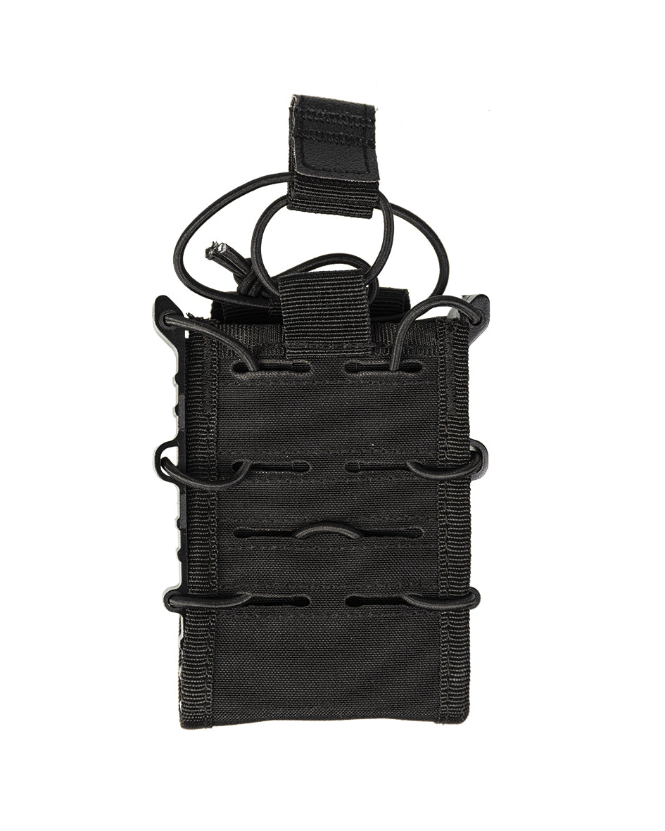 El acabado en color negro mate lo hace versátil para combinar con cualquier equipo táctico, uniforme o chaleco de tiro. Su diseño compacto y ergonómico permite un transporte cómodo sin añadir volumen innecesario al equipamiento.