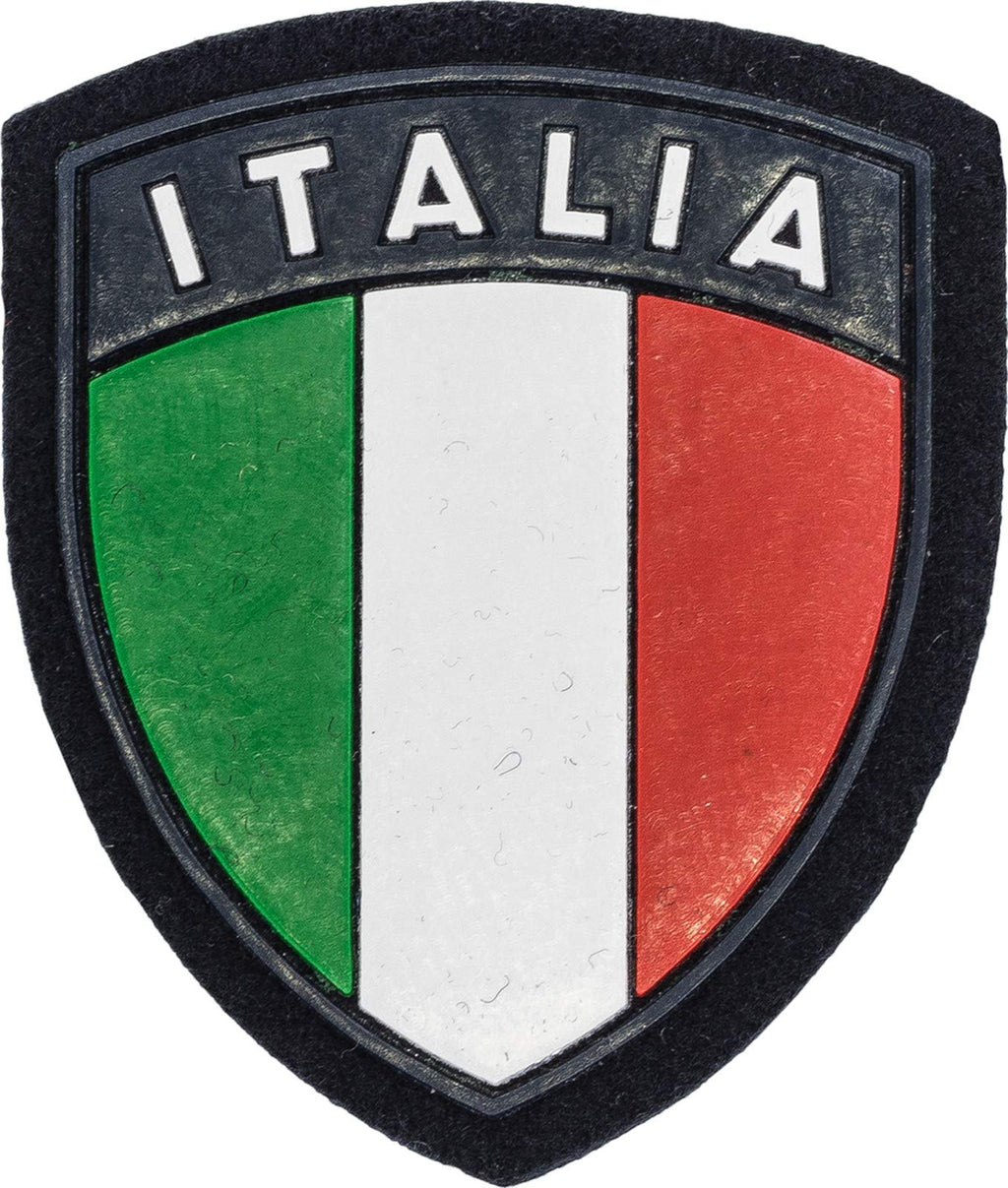 El diseño del escudo italiano destaca sobre el fondo azul marino, creando un contraste visual atractivo que facilita su identificación a distancia. Sus dimensiones compactas lo hacen perfecto para colocar en brazaletes, mochilas, chalecos tácticos o cualquier superficie compatible.