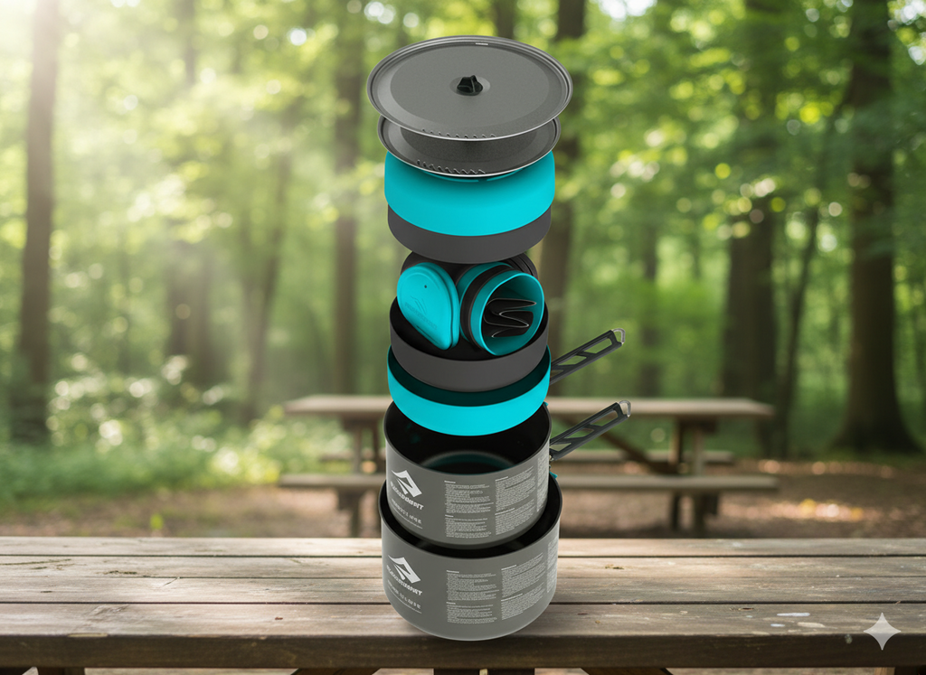 Todo o conjunto pode ser guardado dentro das próprias panelas , otimizando o espaço na mochila e tornando-o a escolha perfeita para expedições, acampamentos e aventuras de vários dias.