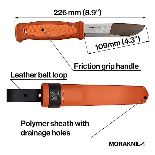 El cuchillo Morakniv Kansbol es una herramienta de alta calidad diseñada para actividades al aire libre y supervivencia. Fabricado por la reconocida marca sueca Mora, cuenta con una hoja de acero inoxidable 12C27 de 109 mm de longitud y 2,5 mm de grosor, con dureza de 56-58 HRC y corte escandinavo que garantiza durabilidad excepcional y facilidad de afilado. Su mango de poliamida resistente ofrece un agarre seguro y firme gracias a su diseño ergonómico con superficie antideslizante. La hoja presenta el tradicional diseño de rombos y está especialmente diseñada para uso con pedernal, siendo ideal para encender fuego. Incluye una funda de plástico ligera en color naranja quemado con clip para cinturón y el innovador sistema Multi-Mount que permite fijación universal compatible con ataduras Molle. El cuchillo se puede guardar en la funda desde cualquier dirección y es apto tanto para usuarios diestros como zurdos. Con un peso total de 177 gramos y longitud de 226 mm, es perfecto para caza, campismo, senderismo y actividades de supervivencia.